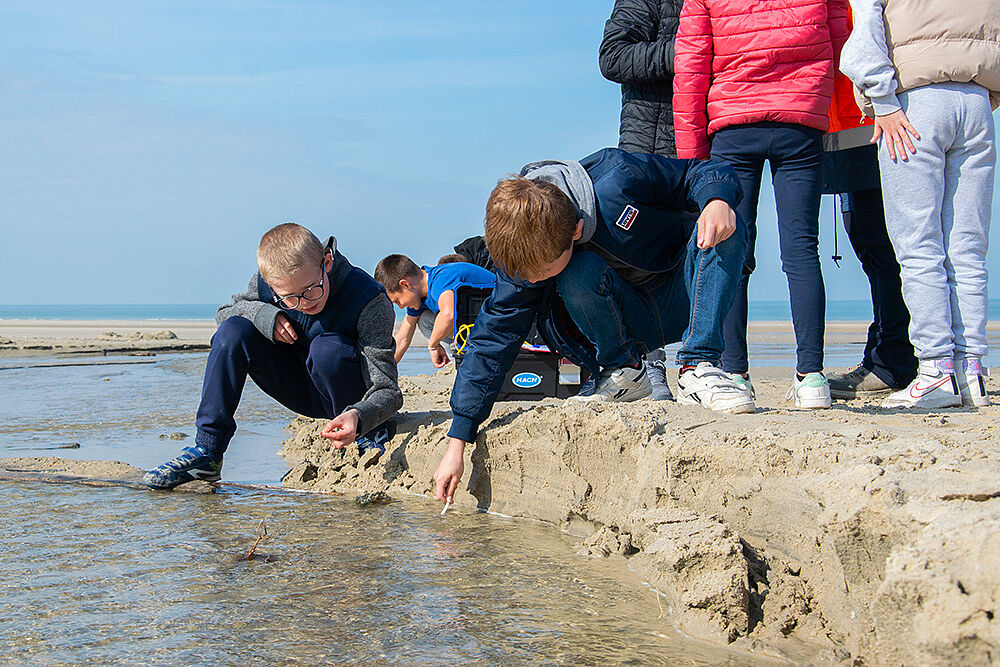Après avoir prélevé l’eau de la Warenne à deux endroits différents, les jeunes se sont répartis en trois groupes sur la plage.